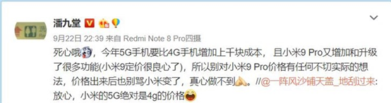 有网友称,“小米的5G绝对是4G的价格”,对此潘九堂回复称,“今年5G手机要比4G手机增加上千块成本,且小米9 Pro又增加和升级了很多功能(小米9定价很良心了),所以别对小米9 Pro价格有任何不切实际的想法,价格出来后也别骂小米变了,真心做不到。”