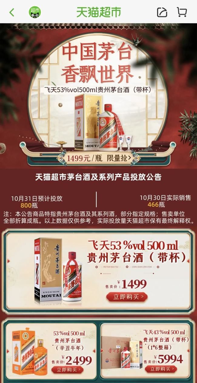 天猫则是从10月22日开始,每晚8点在天猫超市上架500ml飞天茅台,每人限购2瓶。此前的“双11”,天猫超市都是单日集中放量,今年改为了每日平均放量,预计共有21次放量。