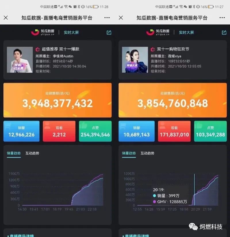 10月20日天猫开启预售首日时,第三方直播数据平台红人点集数据显示,按预售定金计算尾款数据,李佳琦直播间预计的销售额达115.39亿元,薇娅直播间销售额达85.33亿元。而另一数据平台知瓜数据查询的数据则是,薇娅销售额38.5亿,李佳琦销售额39.5亿元。两个数据平台的数据相差近三倍。