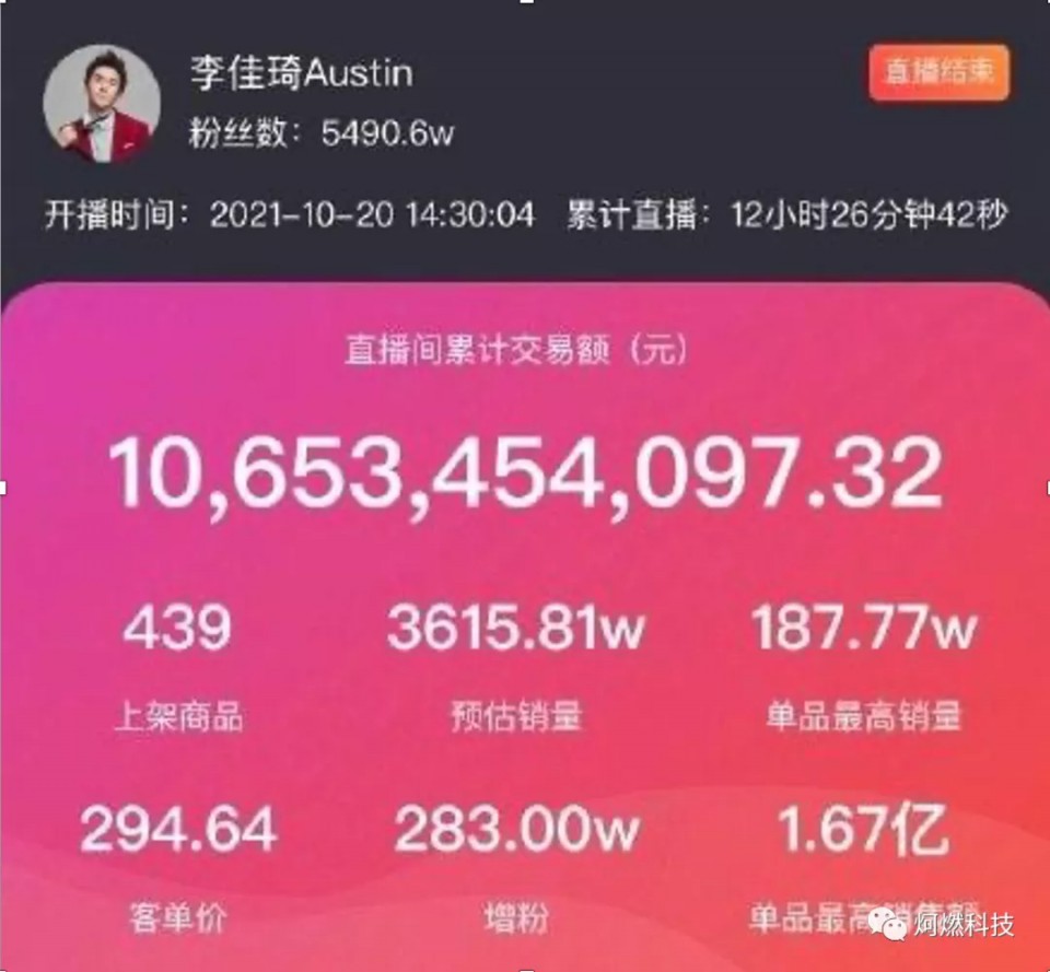 根据披露的数据,李佳琦于10月20日下昼3点开播,截至直播中止,李佳琦直播间累计观看量为2.48亿人次。
