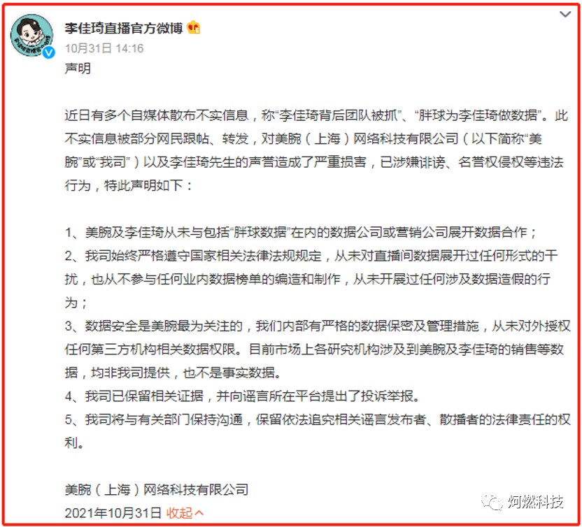 李佳琦直播官方微博10月31日发布声明称,美腕及李佳琦从未与包括“胖球数据”在内的数据公司或营销公司展开数据合作;美腕始终严格遵守国家相关法律法规规定,从未对直播间数据展开过任何形式的干扰,也从不参与任何业内数据榜单的编造和制作,从未开展过任何涉及数据造假的行为;数据安全是美腕最为关注的,公司内部有严格的数据保密及管理措施,从未对外授权任何第三方机构相关数据权限。目前市场上各研究机构涉及到美腕及李佳琦的销售等数据,均非公司提供,也不是事实数据。