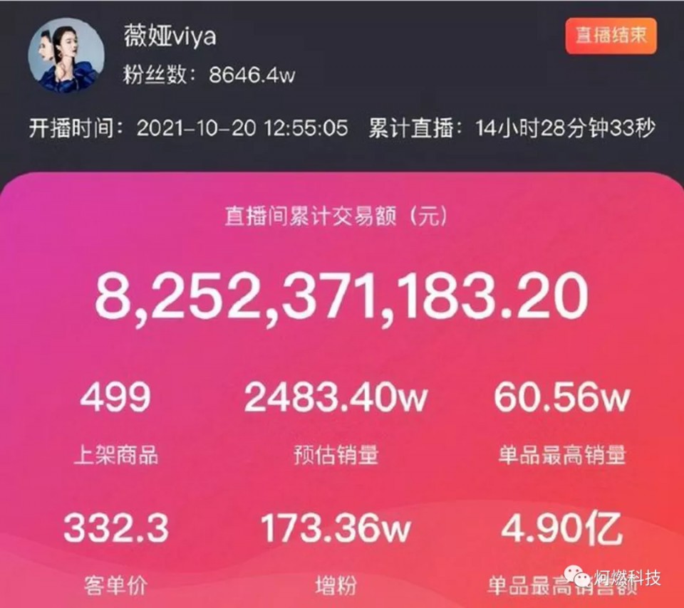 实际上,当晚完整的直播数据更惊人。据媒体披露,10月20日晚,双11活动正式开启,根据淘宝直播数据,当晚共计有4.88亿人次观看李佳琦、薇娅两大头部主播的直播带货,李佳琦在当晚直播最终销售额达到106.53亿元,薇娅直播销售额为82.52亿元,合计成交额高达189亿元。