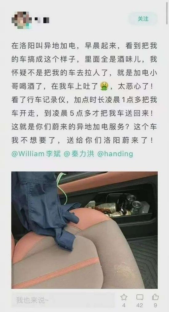 日前,蔚来车主黄女士在蔚来APP中发帖反映,在洛阳叫了异地加电之后,发现车内都是酒味以及一些呕吐物,怀疑蔚来工作人员喝酒,于是回看了行车记录仪,发现加电工作人员凌晨1点多将车开走,凌晨5点多才将汽车送回,并且在车上吐了,对此,车主质疑蔚来的异地加电服务。