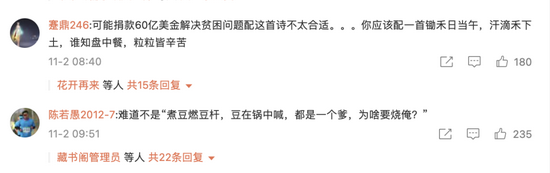对此,微博评论区有网民调侃称,可能捐款60亿美金解决贫困问题配这首诗不太合适,你应该配一首锄禾日当午,汗滴禾下土,谁知盘中餐,粒粒皆辛苦!