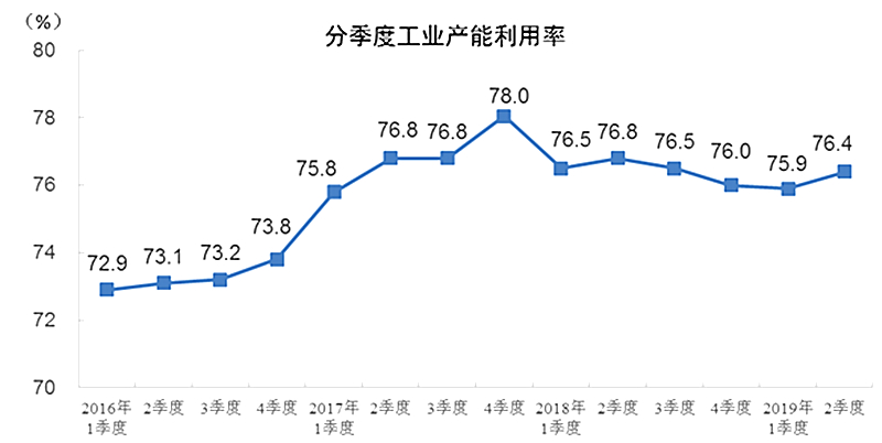 人民网北京7月15日电 (任妍)国家统计局今日公布数据显示,2019年二季度,全国工业产能利用率为76.4%,比上年同期下降0.4个百分点,比一季度上升0.5个百分点。上半年累计,全国工业产能利用率为76.2%,比上年同期下降0.5个百分点。
