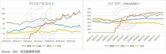 相比之下,泛娱乐化定位,且与用户需求匹配的微博、抖音等平台,用户使用时长和用户粘性(DAU/MAU)都是正向增长。