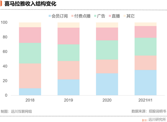 喜马拉雅的收入来自五部分,会员订阅、付费点播、广告、直播和其他。会员订阅及付费点播收入是顶梁柱,2021年上半年为54.6%,其次是广告和直播,分别占总收入的24.5%和16%。