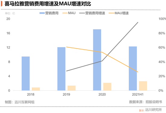 从招股书反映的数据来看,喜马拉雅的营销费用在过去一年中持续加码,今年上半年的营销费用已占总收入的49.1%,然而同期月活用户增速反而在放缓,如同碰到了隐形的墙。