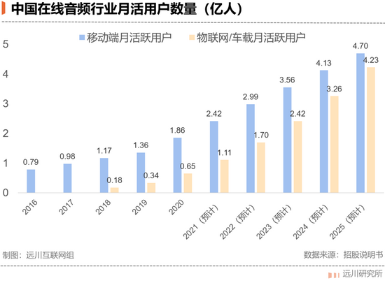 根据喜马拉雅专门请灼识咨询(花了80万)做的中国在线音频市场的调查分析报告显示,2020年在线音频行业移动端平均月活跃用户1.86亿人,物联网及车载月活用户0.65亿人,而到2025年这两个数字分别预计为4.7亿人和4.23亿人。