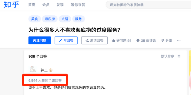 而在知乎上,一则关于“为什么很多人不喜欢海底捞的过度服务?”帖子中,更是有数千人对类似遭遇表示了赞同。
