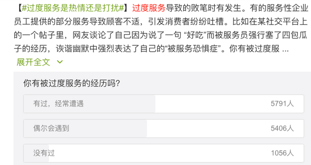 在更早期的一份微博调查中,有5000余人表示“经常遭遇过度服务”。