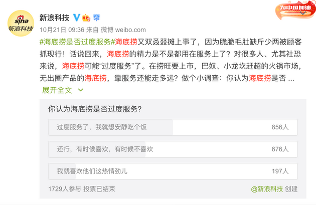 与此同时,海底捞引以为豪的“服务”开始受到更多人质疑。在新浪科技近期发起的一份关于“海底捞是否过度服务”的微博调查中,有49.5%的网友认为其“过度服务了”。