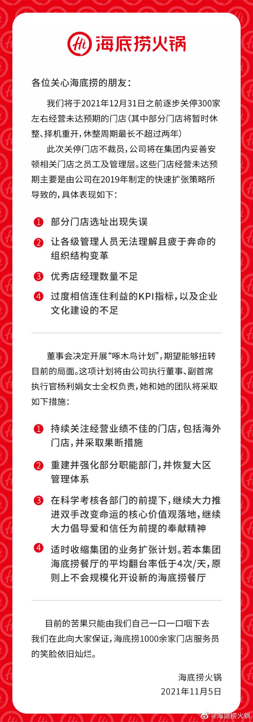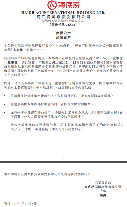 11月5日晚,海底捞在港交所发布公告,集团决定在2021年12月31日前逐步关停300家左右客流量相对较低及经营业绩不如预期的海底捞门店。