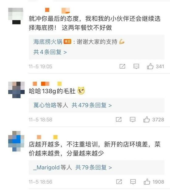 但也有网友认为,“这才是聪明的企业,关闭了是为了以后更好的发展,往长远看。”还有忠实粉丝表示,“就冲这态度,我和我的小伙伴还会继续选择海底捞,这两年餐饮不好做。”