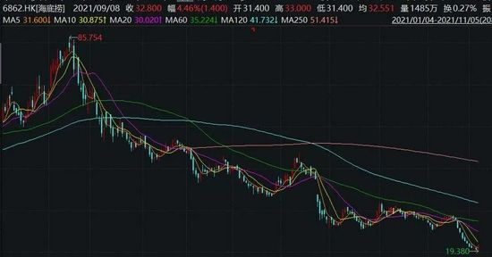 对应下滑的业绩,海底捞股价一路走低。截至2021年11月5日收盘,海底捞股价报21.05港元,总市值为1149亿港元。股价较2021年2月的历史最高点85.75港元已累计下跌75%,市值也随之缩水了四分之三。