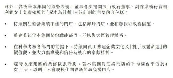 此外,为改善经营表现,海底捞决定开展“啄木鸟计划”。该计划的主要内容包括:持续关注经营业绩不佳的门店,并相应采取改善措施;恢复大区管理体系;适时收缩业务扩张计划,若平均翻台率低于4次/天,原则上不会规模化开设新的海底捞门店。
