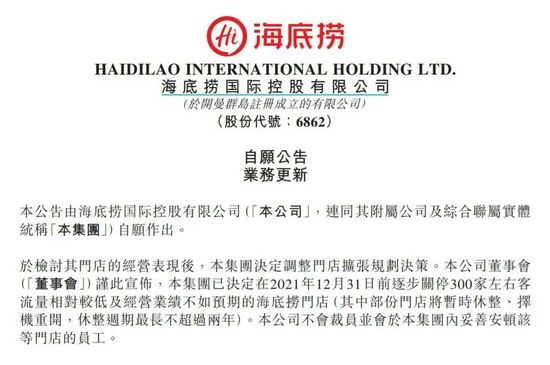 11月5日晚,海底捞发布公告称决定调整门店扩张规划决策,将在2021年12月31日前逐步关停300家左右门店。上述消息披露后,立即引发了全网关注,相关话题热度一度占据微博热搜榜第一名。