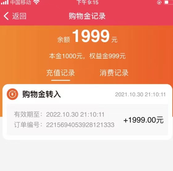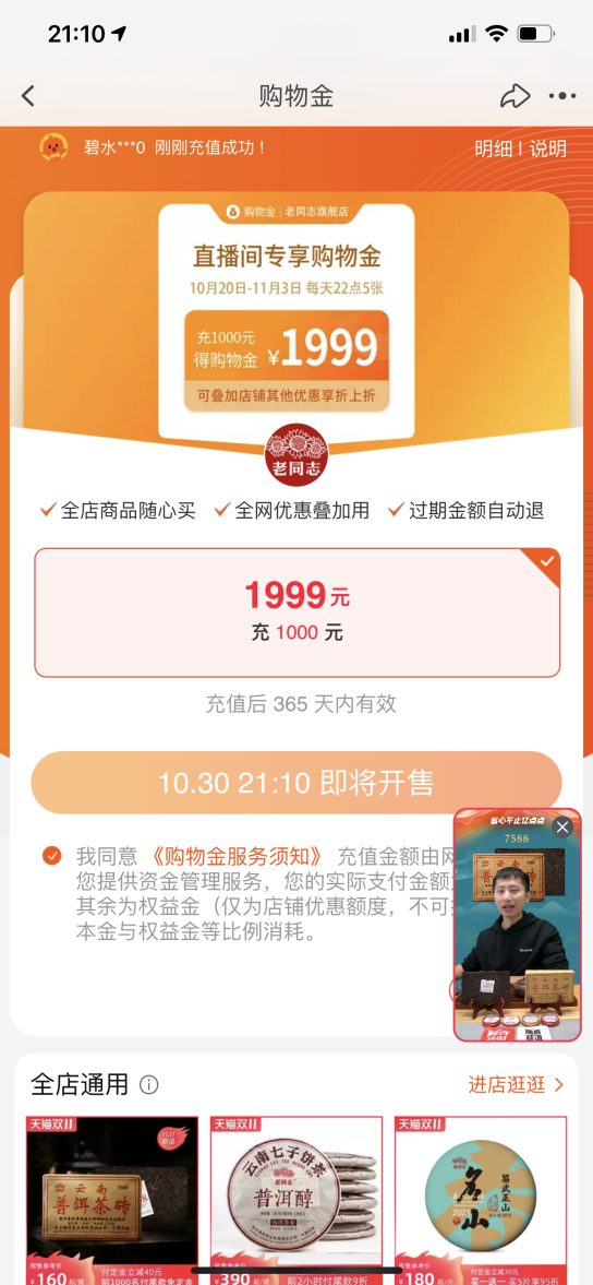 今年10月下旬,潘先生登录老同志旗舰店购买茶叶时发现,该店推出了一个名为“充值购物金享折上折”的活动,其中有一个“充1000元抢购19999元购物金”的活动。
