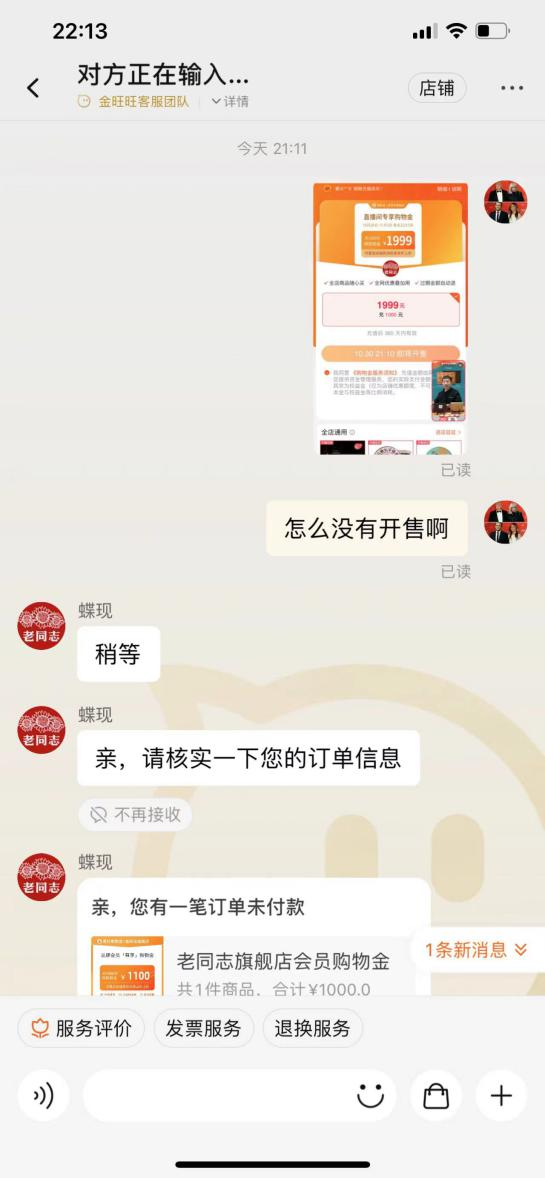 老同志旗舰店的客服回复潘先生,他们当晚21:10确实投放了5张购物券,已经被其他消费者抢走,并发给潘先生一张“21:10:11”抢券截图;对于为什么21:11还显示“即将开售”,老同志旗舰店的客服未能给出答复。