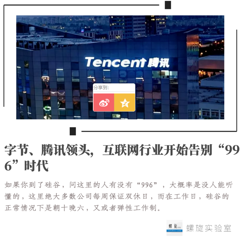 无独有偶,在字节跳动传出“1075”工作制调整后,腾讯也被媒体爆料将采用“965”工作制,即9点上班,6点下班,工作5天,而且下班后员工加班也需要申请,且加班时长与领导的绩效考核挂钩。