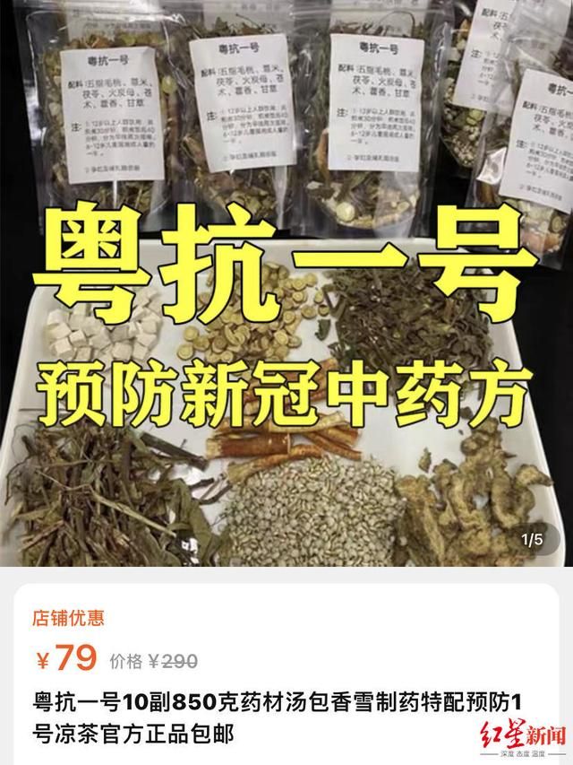 红星资本局梳理发现,今年6月份“粤抗1号”在网上火爆一时,该产品声称具有居家预防新冠作用,并被多家媒体报道过。据悉,产品一经上线,订单十分火爆。从平日里四五十个订单瞬间激增到日均五百多单。11月7日,红星资本局在淘宝网搜索“粤抗1号”,发现该相关产品的中药方仍在出售,产品宣传语中标明“预防新冠中药方”等字眼。