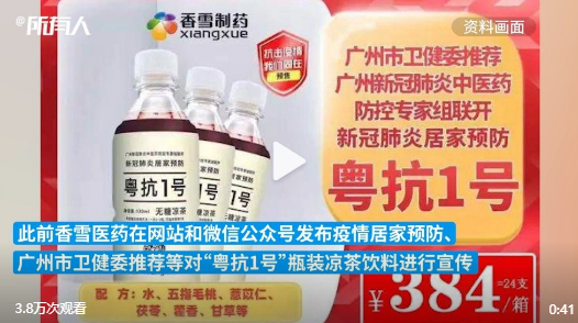 对此,广州市黄埔区市场监督管理局表示,香雪医药无法提供材料证明广州市卫健委、广州疫情中医药防控专家组推荐过“粤抗1号”瓶装凉茶,无法提供材料证明“粤抗1号”瓶装凉茶有居家预防疫情的作用,无法提供“5盒疗程装”用语表述的根据。