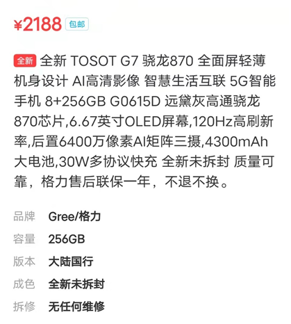 截至11月9日,格力电器(000651.SZ)最新推出的TOSOT大松手机G7已经上架销售四天,总销量为2159台,目前闲鱼平台已有人降价处理。
