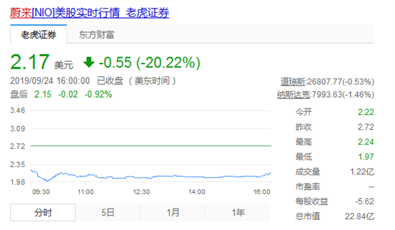 坏消息还不止如此,受亏损消息影响,蔚来汽车的股价下跌20.22%至2.17美元,总市值为22.84亿美金。