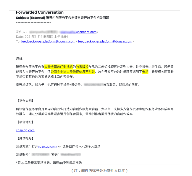 此前,我们也多次申请微信开放平台恢复抖音和西瓜视频的分享、登录功能,以便双方用户更顺畅地实现信息分享。针对腾讯此次的申请,我们已经回复邮件,双方产品技术人员将尽快推进相关细节。