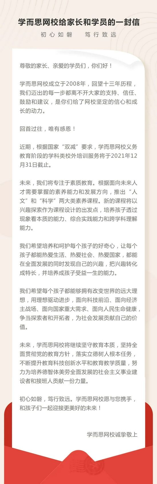 ——学而思网校给家长和学员的一封信