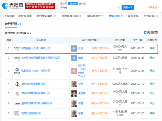 9月23日,联想控股旗下公司——联想控股(天津)有限公司法人代表发生变更,柳传志卸任并不再担任该公司董事,工商资料显示,接任公司法人代表及董事长的为深圳市瑞龙和实业有限公司法人代表张欣。