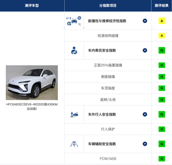 蔚来EC6表现也比较优秀,参与碰撞的车型是蔚来EC6 2020款430KM运动版,该车型除了耐撞性与维修经济性指数获得A(良好)评级为,其它均为G(优秀)。
