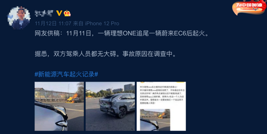 有网友认为,从蔚来EC6车尾的损害程度来看,两车的撞击力度不小,但是理想ONE起火确实有点出乎意料。截止发稿前,理想和蔚来均未回应此事故。