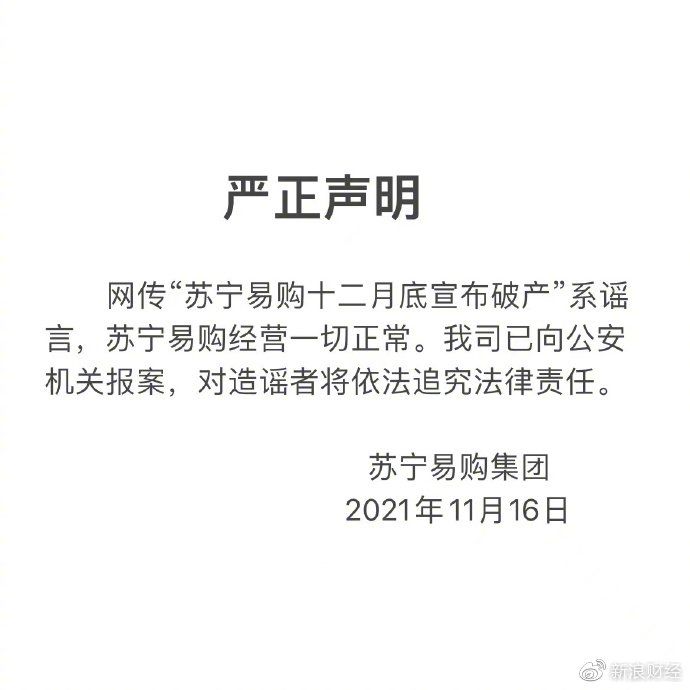 商业 苏宁易购回应十二月破产传闻:谣言,已报案 2021-11-16 10:22:01 分享 来源:新浪财经11月16日上午消息,苏宁易购发布辟谣声明称,“苏宁易购十二月底宣布破产”为谣言,公司经营一切正常。苏宁易购已向公安机关报案,对造谣者将依法追究法律责任。