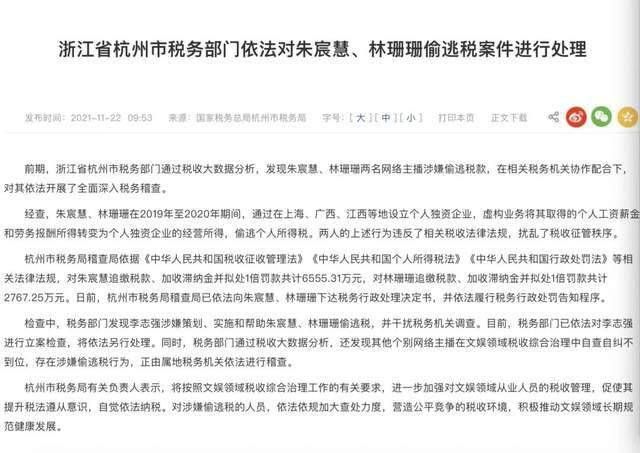 当天,国家税务总局浙江省杭州市税务局发布通报,杭州市税务部门依法对网络主播朱宸慧(微博ID:雪梨Cherie)、林珊珊(微博ID:林珊珊_Sunny)偷逃税款案件进行处理,两人被依法追缴税款、加收滞纳金并处罚款分别计6555.31万元和2767.25万元。