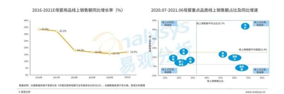 2020年,母婴用品行业整体规模略有下降的情况下,线上销售额仍以15.7%的同比增速增长,线上销售额占比进一步提升,但增速趋缓。因线下渠道拥有更好的服务、体验等,线下市场份额依然稳固,未来线上线下市场份额或将趋稳。奶粉、婴儿食品、奶瓶、奶嘴等对信任度更高的产品,线下市场依然占据绝对优势。尿裤、纸巾等用品线上市场份额进一步扩大,洗护品牌市场集中度低,部分品牌利用短视频、直播等新型营销方式,快速破局,增速显著。