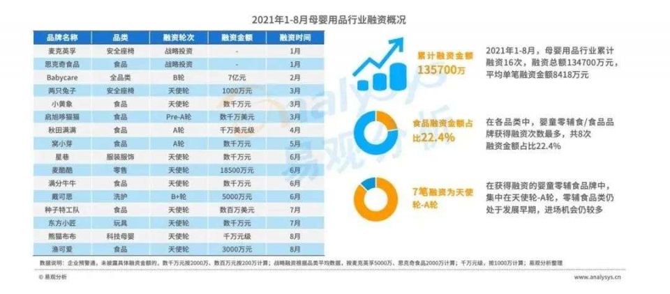 在获得融资的婴童零辅食品牌中,集中在天使轮-A轮,零辅食品类仍处于发展早期,进场机会仍较多。