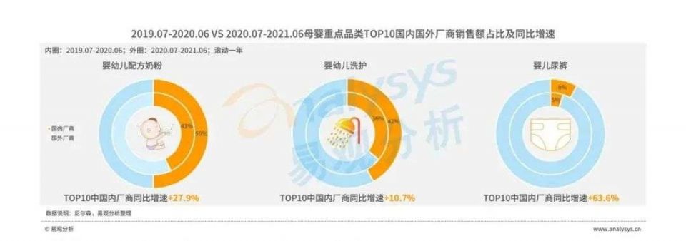 随着国内对食品安全的重视、国产产品品质提升、人民自信心提升,母婴国货品牌认可度明显提升。尤其2020年,因国内疫情快速平复,国货品牌市场份额挤压国际品牌趋势加强。奶粉、婴幼儿食品、婴儿洗护产品、婴儿尿布、童装童鞋等各品类,均呈现明显的国潮化趋势。