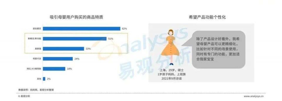 新生代妈妈更喜欢个性化、精细化商品,更愿意购买具有新概念/新功能及高颜值产品。根据访谈,不少90后、95后妈妈希望母婴产品功能更加精细、个性,更加适合宝宝。