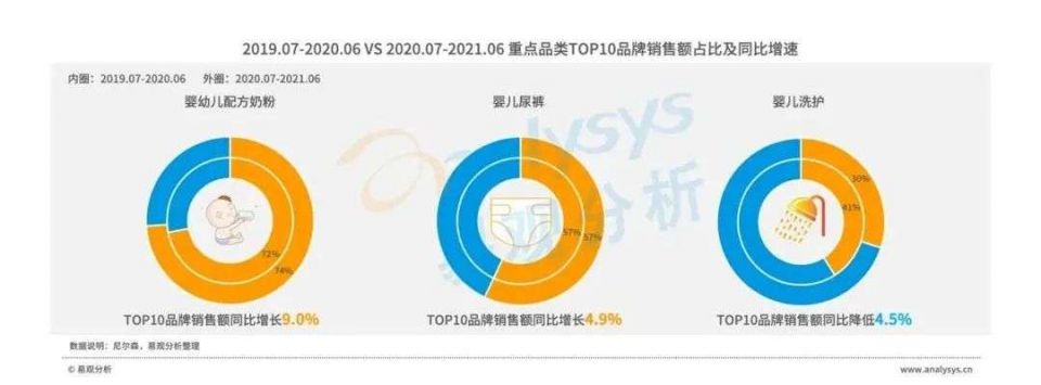 婴儿奶粉TOP10品牌市场集中度提升明显,呈现强者恒强态势。婴儿尿布在2020年整体市场竞争加剧态势下,TOP10品牌销售额保持增长,头部品牌市场份额保持稳定。婴儿洗护等非标品TOP10集中度降低,市场格局未定,后浪品牌有机会在竞争中脱颖而出。