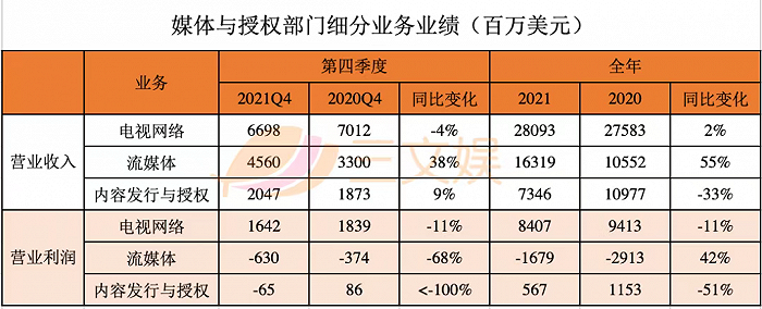 2021财年,流媒体全年营收163.19亿美元,同比增长55%;营业利润亏损16.79亿美元,相比去年亏损收窄42%。这表明,流媒体业务的确有所增长,但仍然处于烧钱的阶段。