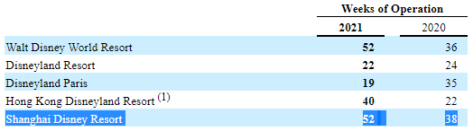 2021财年,佛罗里达和上海两座迪士尼乐园开业52周,香港迪士尼营业40周,佛罗里达和巴黎的迪士尼则分别只营业22周与19周。