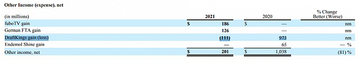 2021财年,迪士尼在DraftKings的投资带来亏损1.11亿美元,上一年是盈利9.73亿美元。