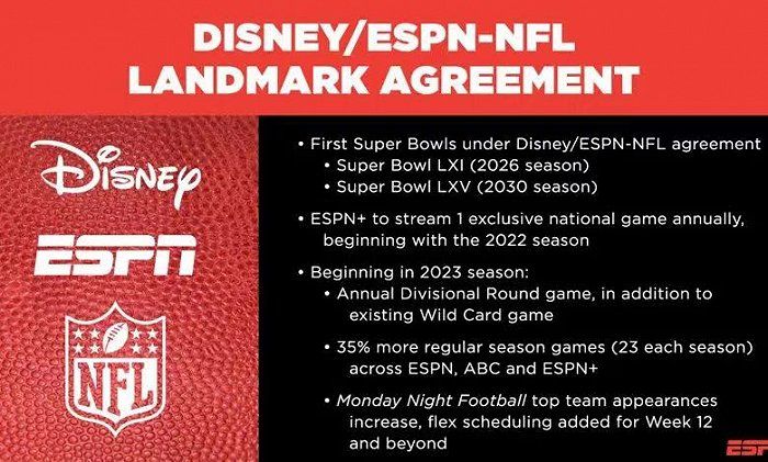 例如,迪士尼与美国职业橄榄球大联盟(NFL)签订了10年的转播权协议,将于2023年生效。