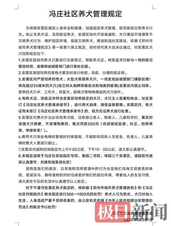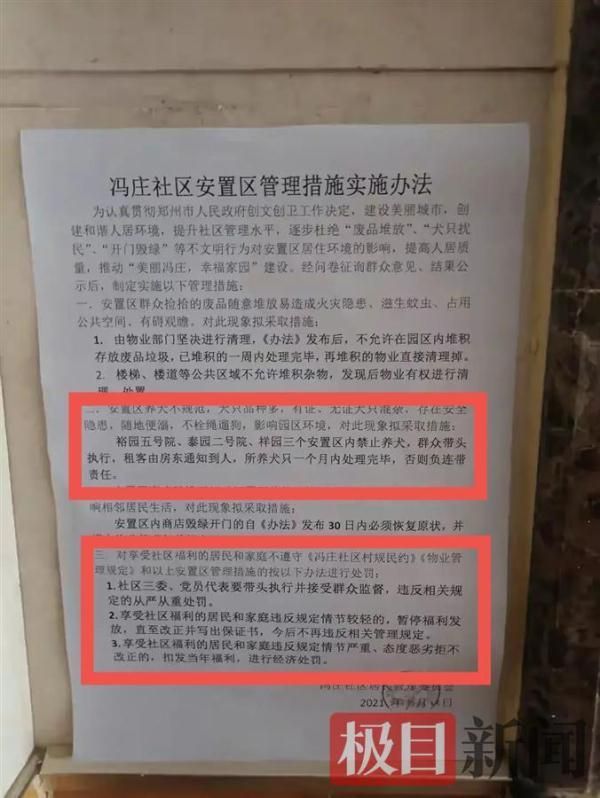 另 一张《冯庄社区安置区管理措施实施办法》显示,裕园五号院、泰园二号院、祥园三个安置区内禁止养犬,群众带头执行,租客由房东通知到人,所养犬只一个月内 治理完毕,否则负连带责任。该《办法》最后一段还显示,对享受社区福利的居民和家庭不遵守《冯庄社区村规民约》《物业管理规定》和以上安置区管理措施的, 视情节轻重,会受到暂停社区福利发放、扣发当年福利等处罚,落款时间为9月23日。