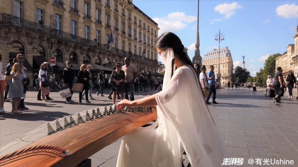 法国波尔多市加隆河畔,路人匆匆,却因为一阵悠扬音乐声的响起,不约而同地停留驻足。寻觅源头, 原来是一位中国女孩,伴一架古筝,着一袭汉服,披一副面纱,动人的音符从她舞动的指尖流淌出来,为充满欧式风情的老城街头带来了迥乎不同的东方美。