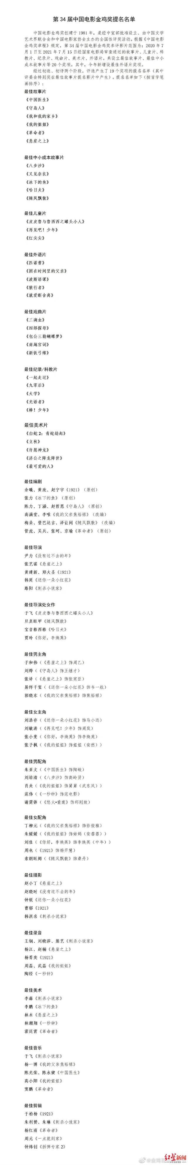 同时,第34届中国电影金鸡奖也公布了提名名单。