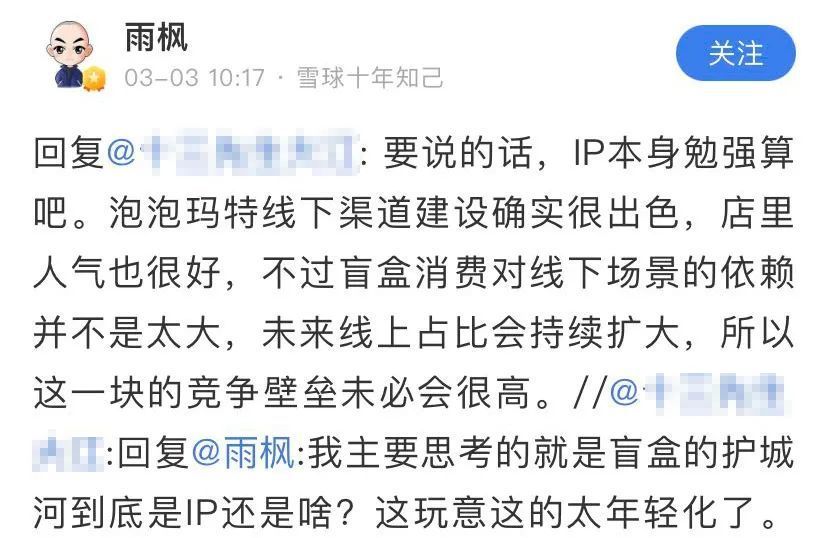 ▲ 雪球球友@雨枫 与网友关于泡泡玛特的交流