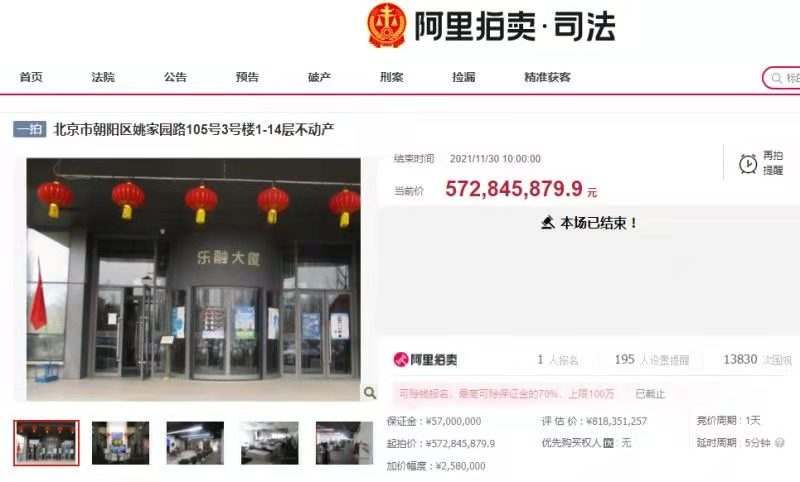 2019年11月,北京市第三中级人民法院对乐融大厦进行公开拍卖,房产评估价约 9.69 亿元,起拍价约 6.78 亿余元, 但随后拍卖被中止,中止原因为案外人对拍卖财产提出异议。