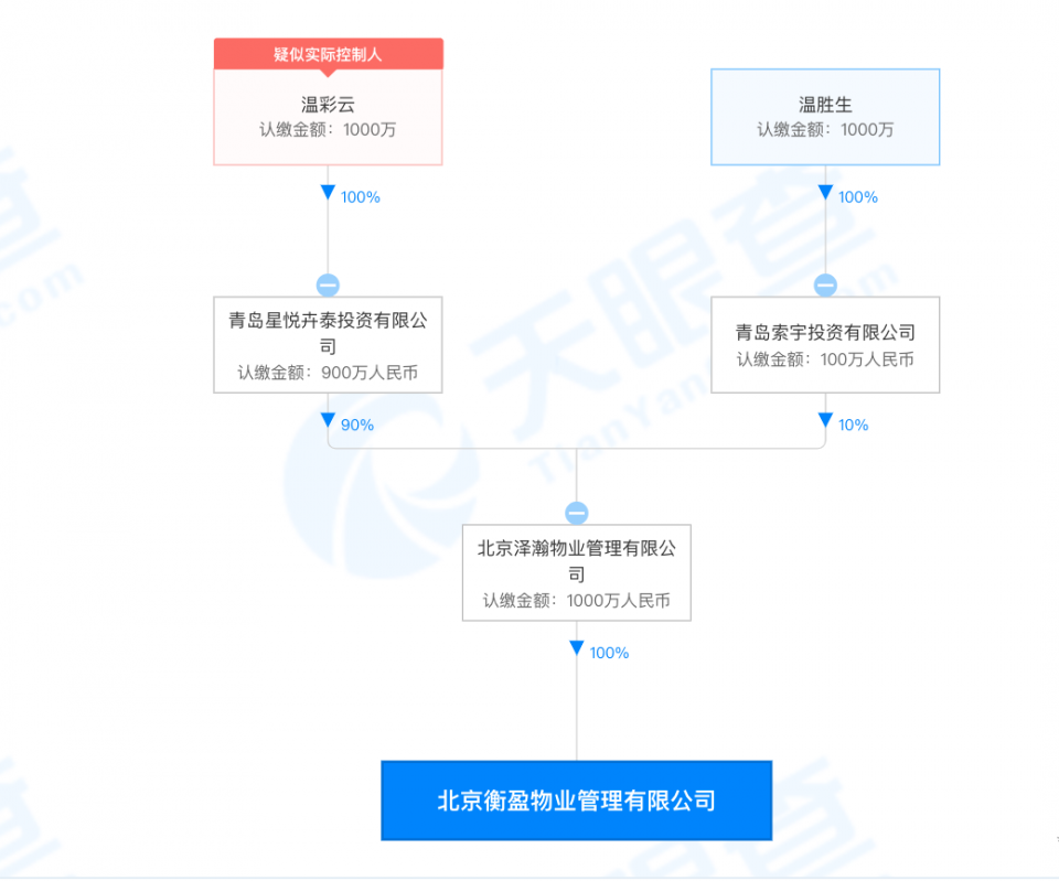 天眼查APP显示,该公司于5天前注册成立,成立日期为2021年11月25日,法定代表人为张弘明,由北京泽瀚物业管理有限公司全资持股。股权穿透信息显示,北京泽涵由青岛星悦卉泰投资有限公司、青岛索宇投资有限公司分别控股90%及10%,实际控制人为温彩云。